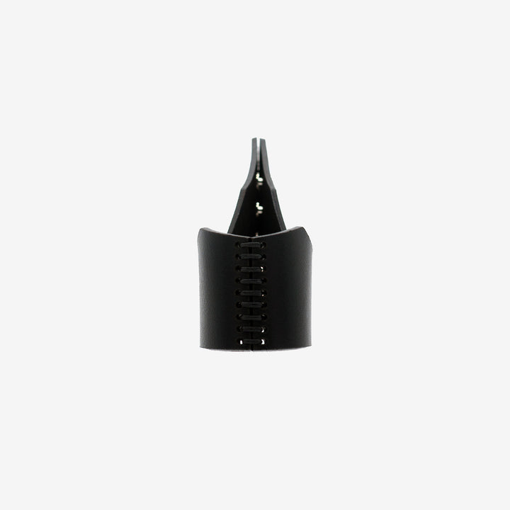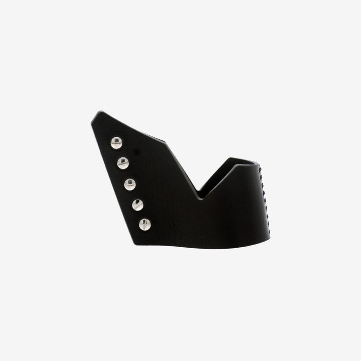 Asymmetrical Leather cuff with central hand-sewn stitches.