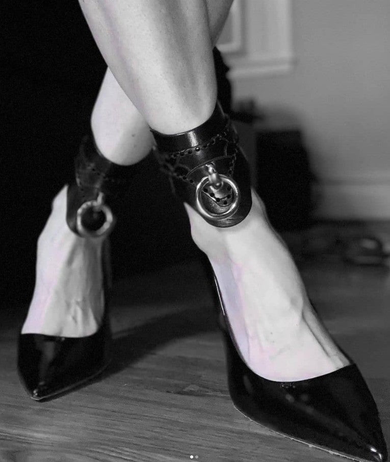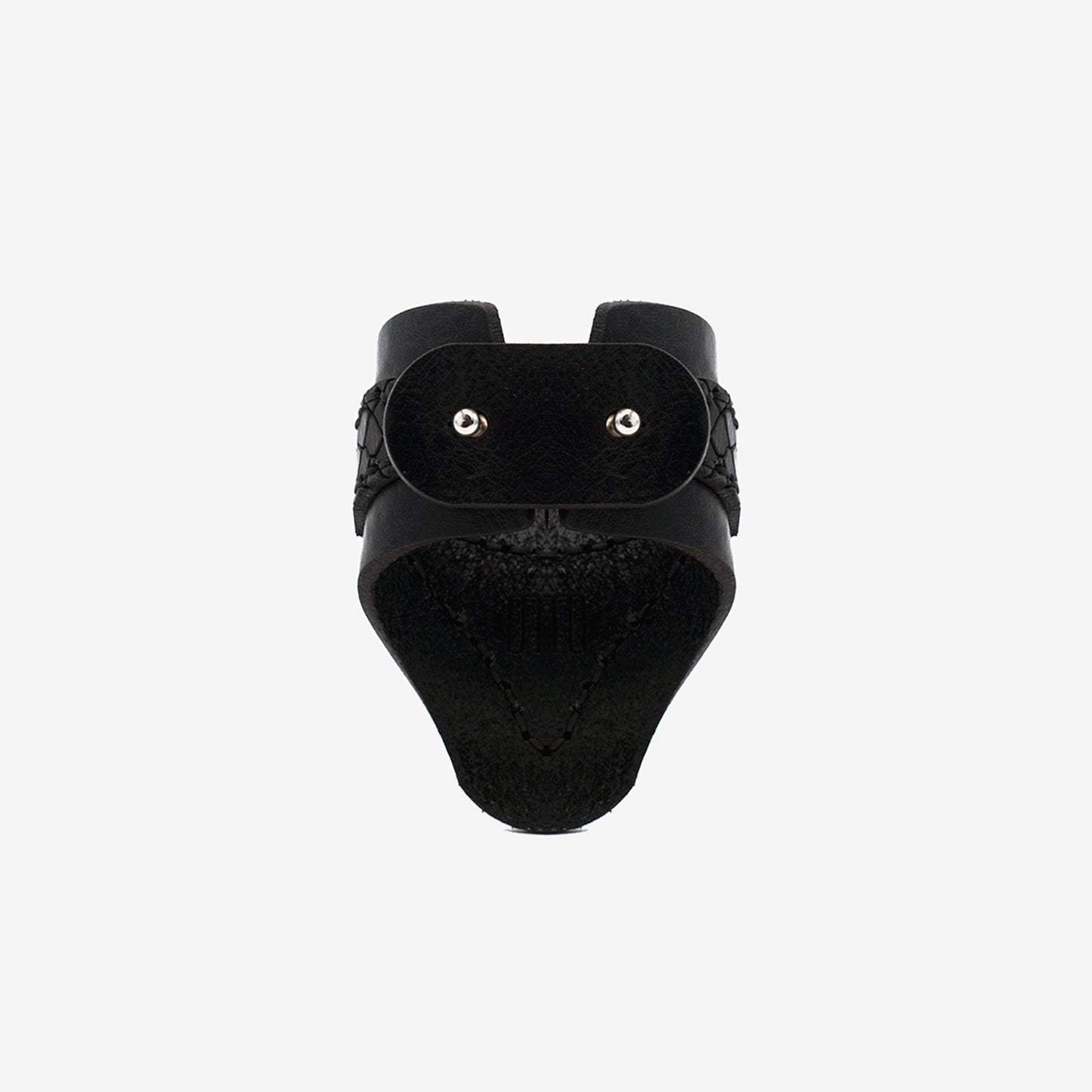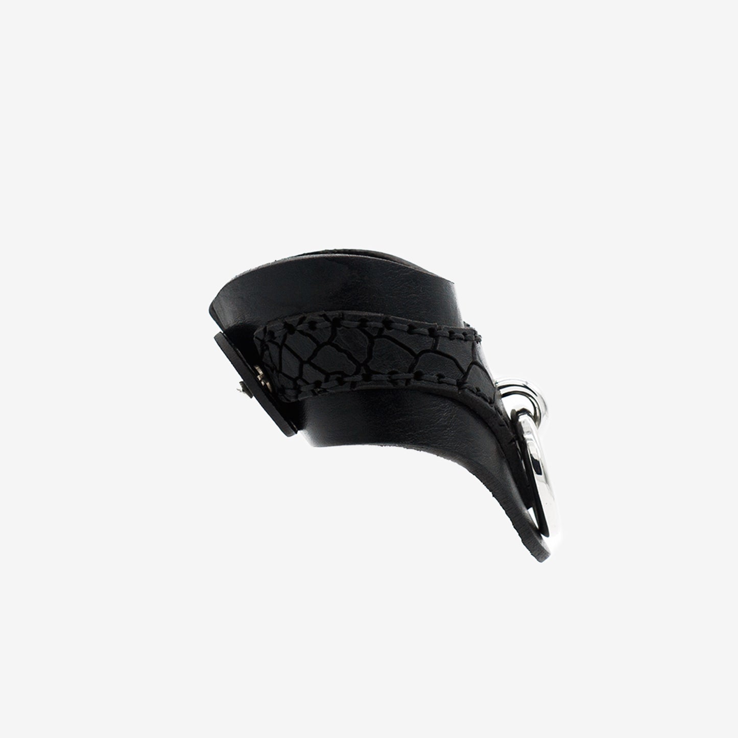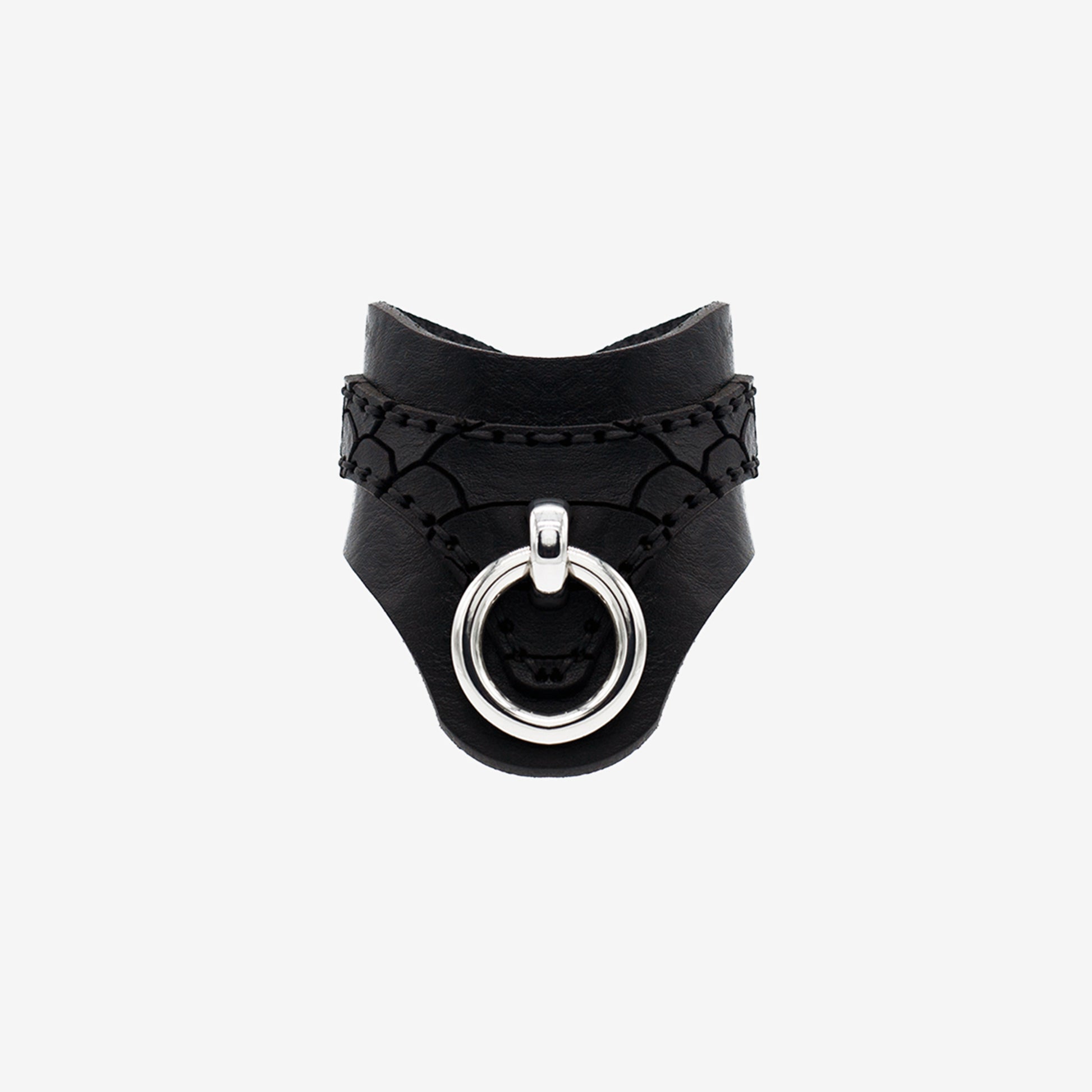 Leather anklet with central metal ring detailed with saddle stitiching and python texture. Finished with a push stud fastening.
