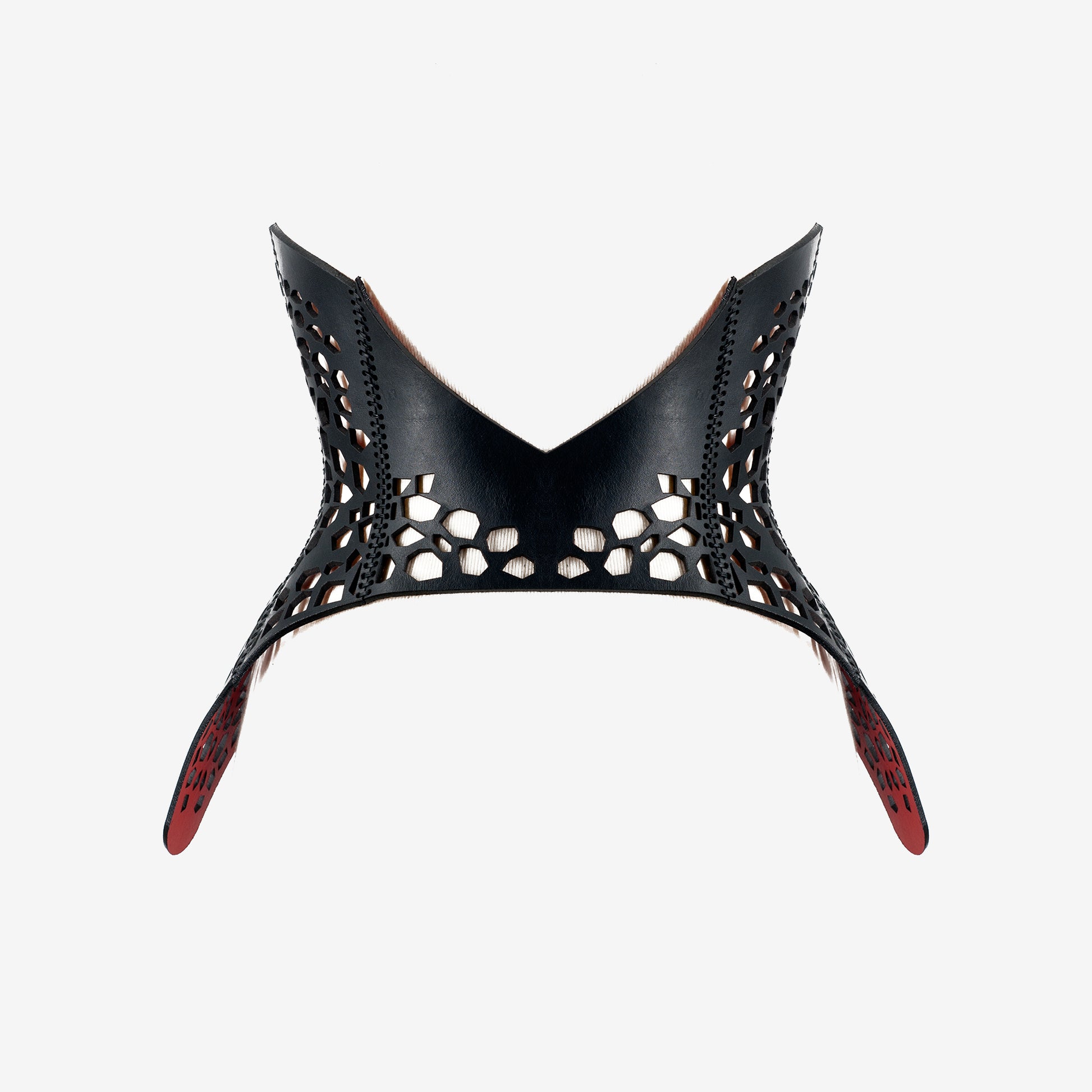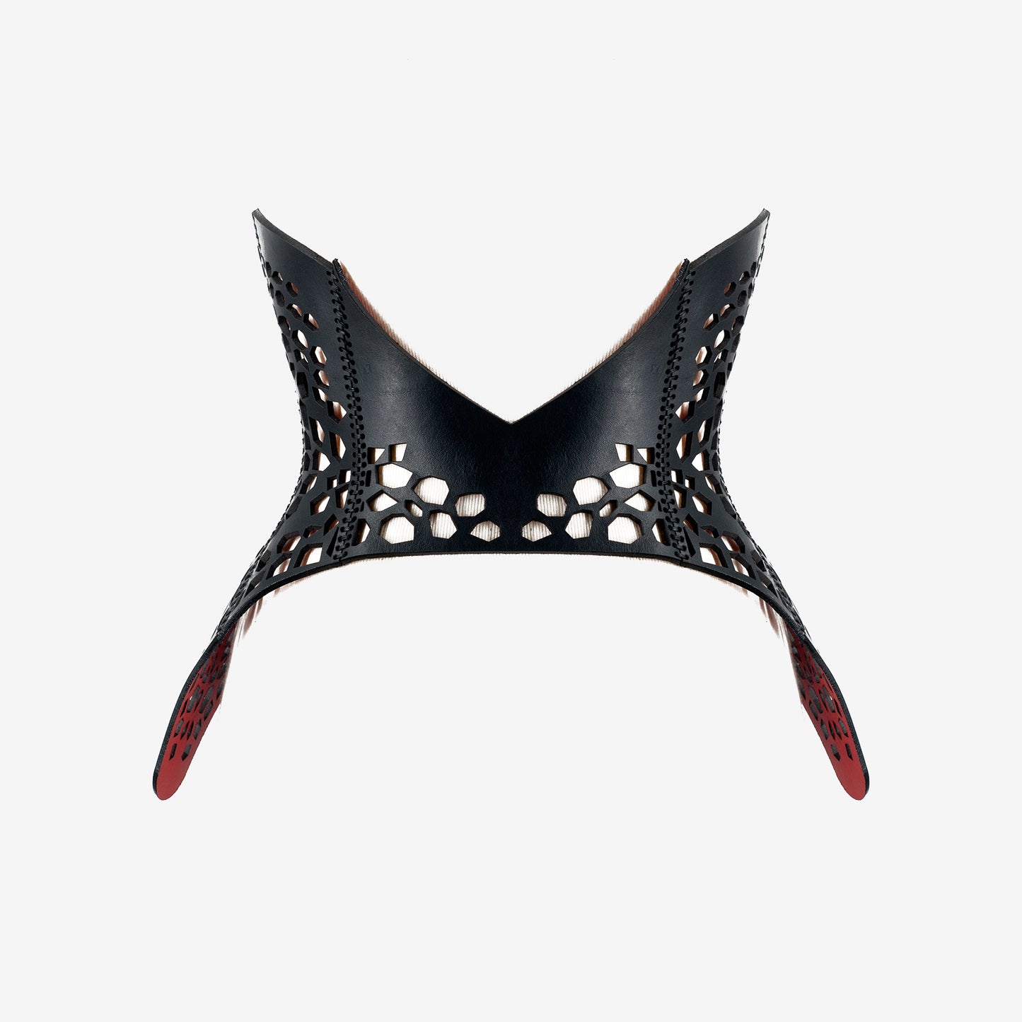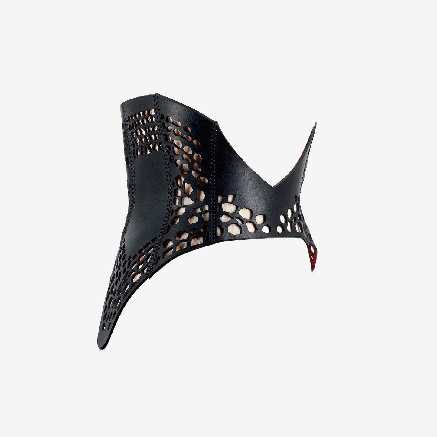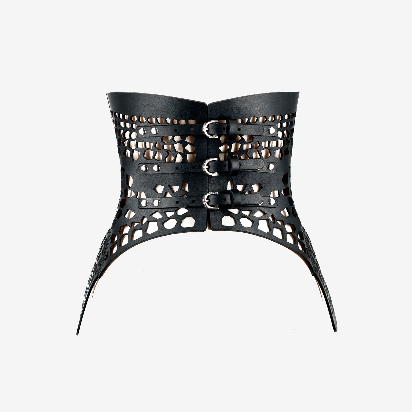 Laser cut leather bustier-belt with silver-toned metal accessories, detailed with saddle stitching. Finished with buckle closures.