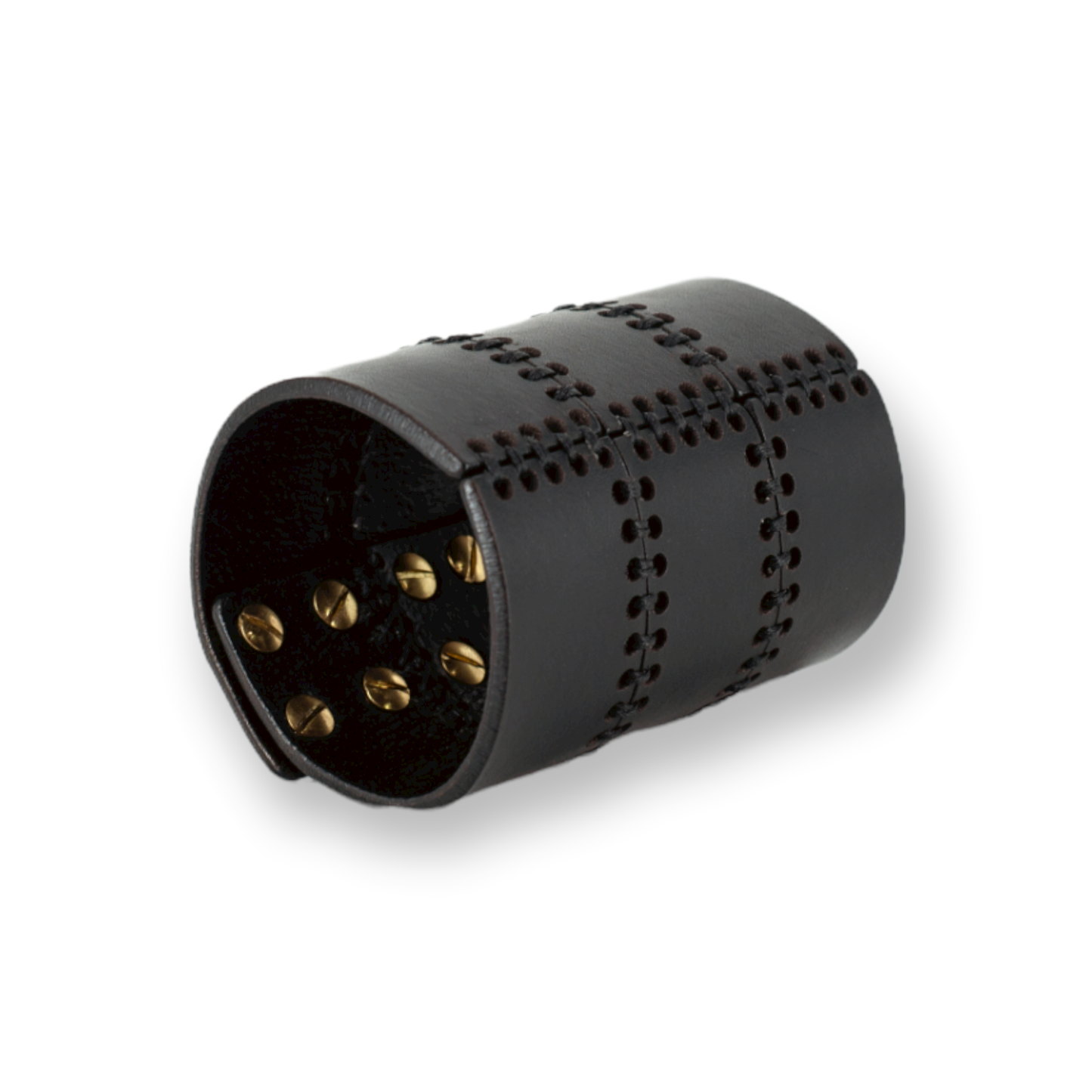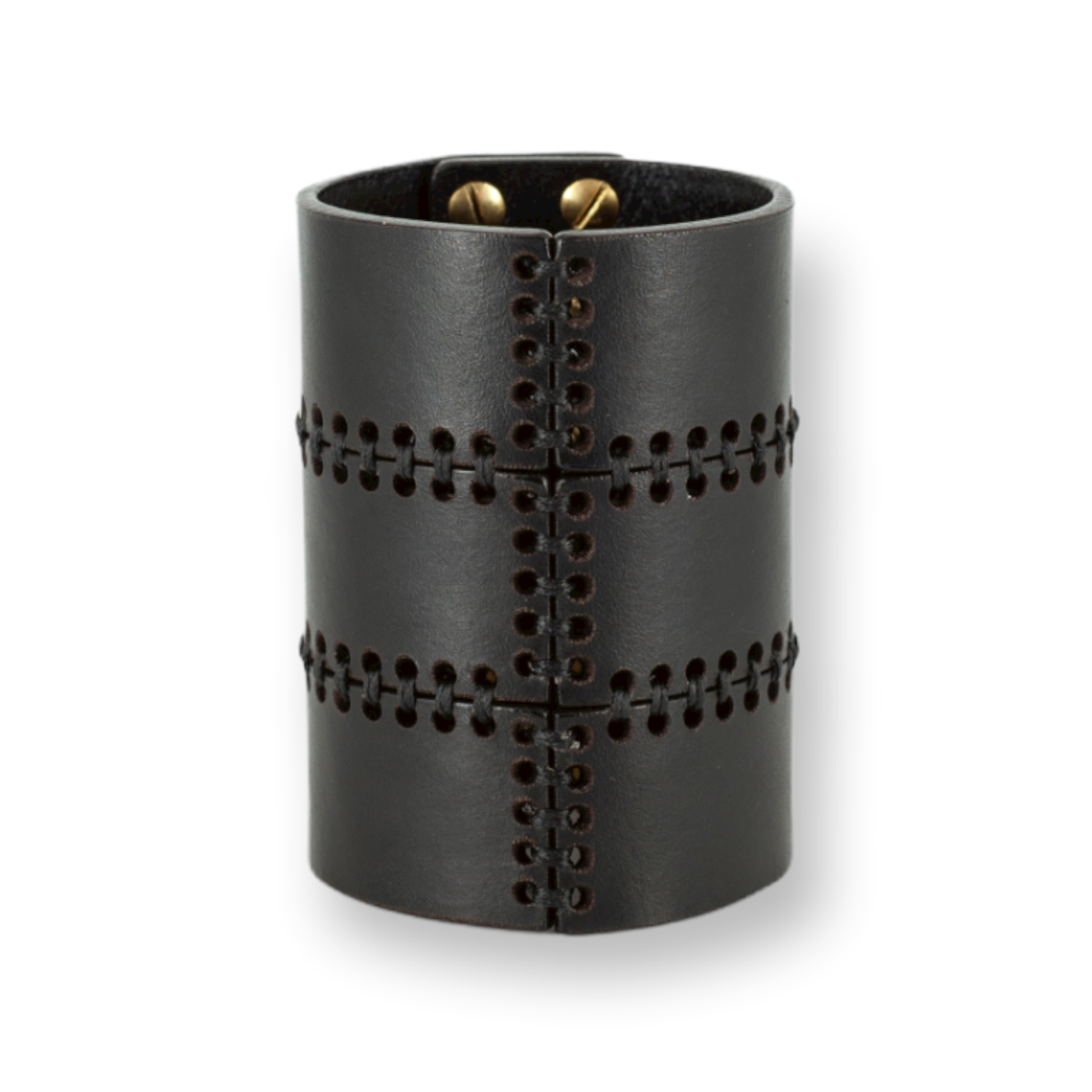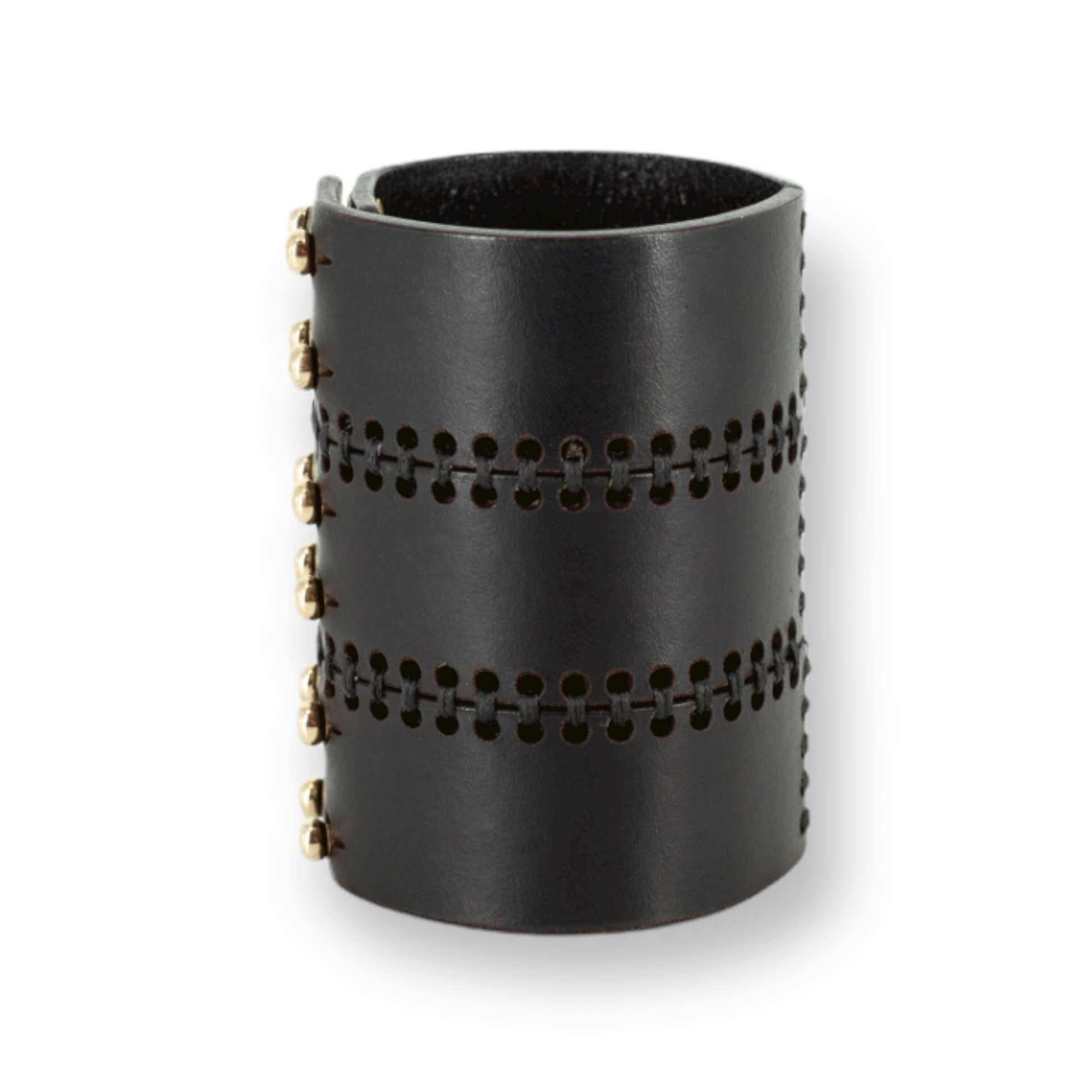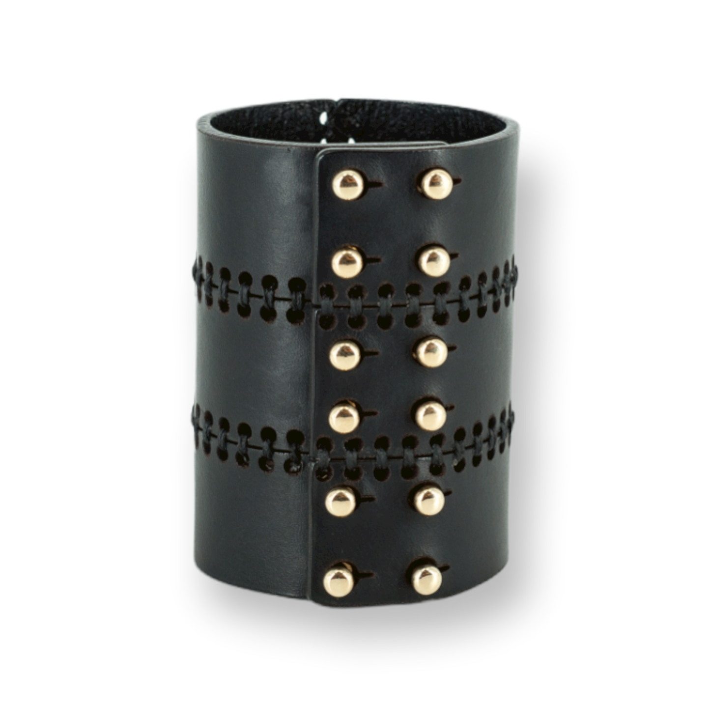Laser cut leather cuff, detailed with saddle stitching. Finished with a push stud fastening.