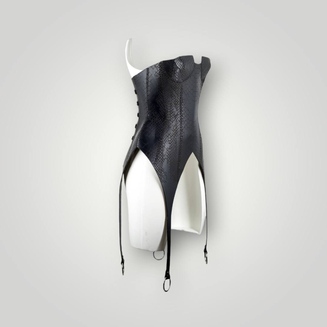 Experience the seductive allure of our Handcrafted Laser-Cut Leather Corset with Garter-like Trails. Meticulously crafted by hand, it features laser-cut and engraved details that create an asymmetrical python-inspired pattern. The garter-like trails add a playful and enticing touch to the design, emulating the look of a garter belt. Secured at the back with five buckles, it provides a secure and adjustable fit, ensuring a perfectly sculpted silhouette. Embrace the artistry and sensuality of this unique corset, embodying seduction and sophisticated style with its asymmetrical python-inspired engraving and garter-like trails. Let this handcrafted masterpiece express your alluring personality.
