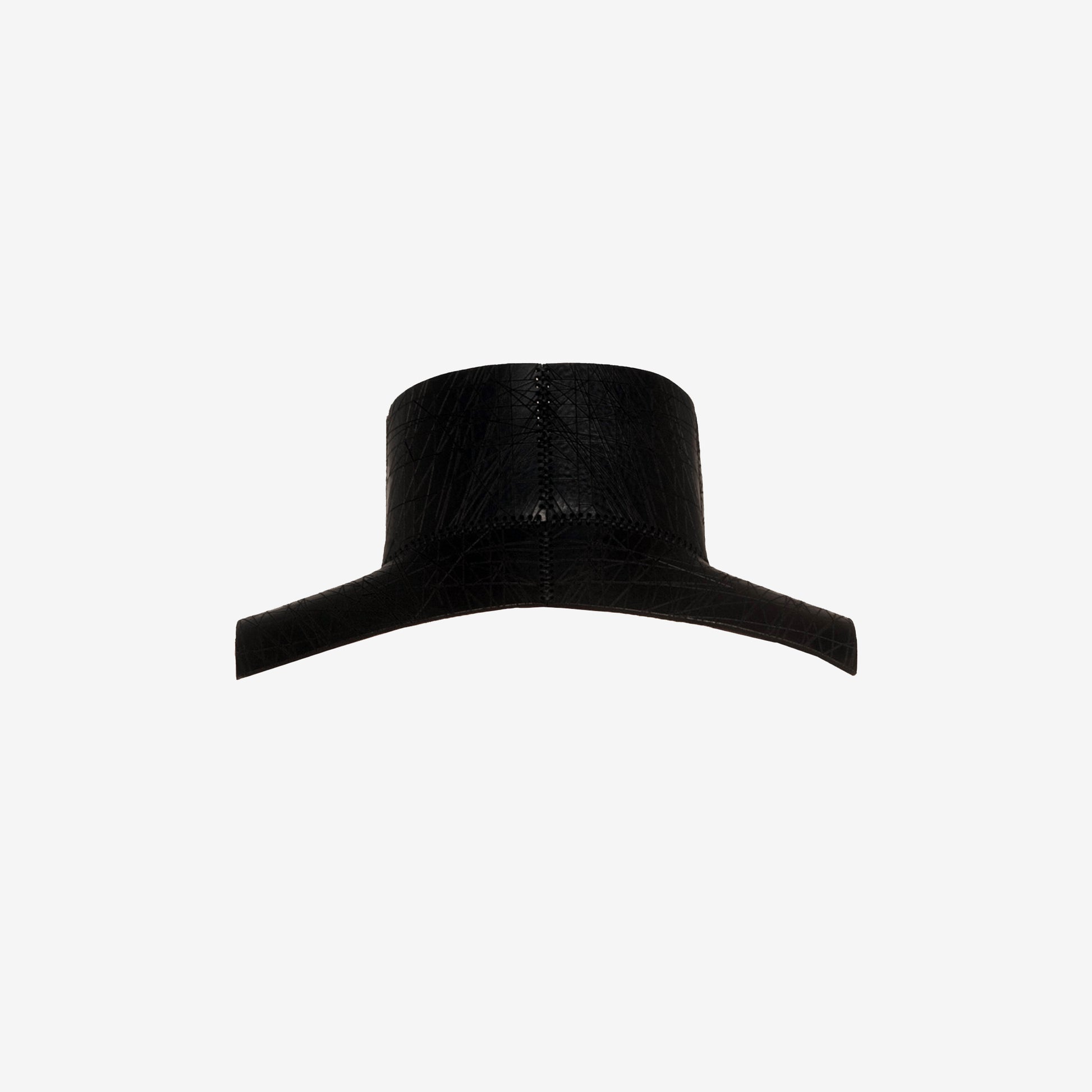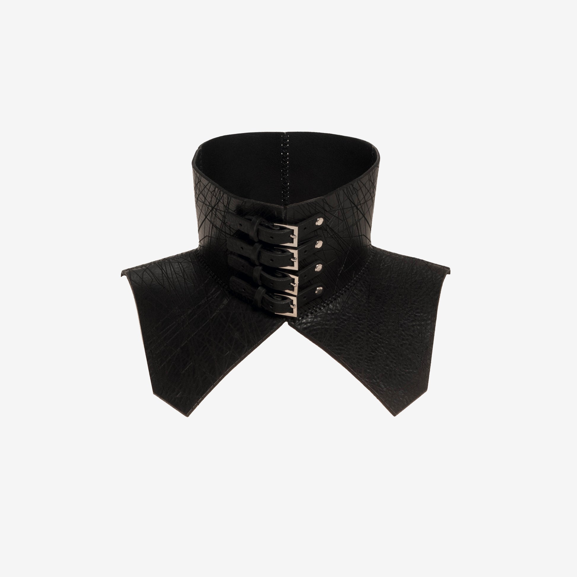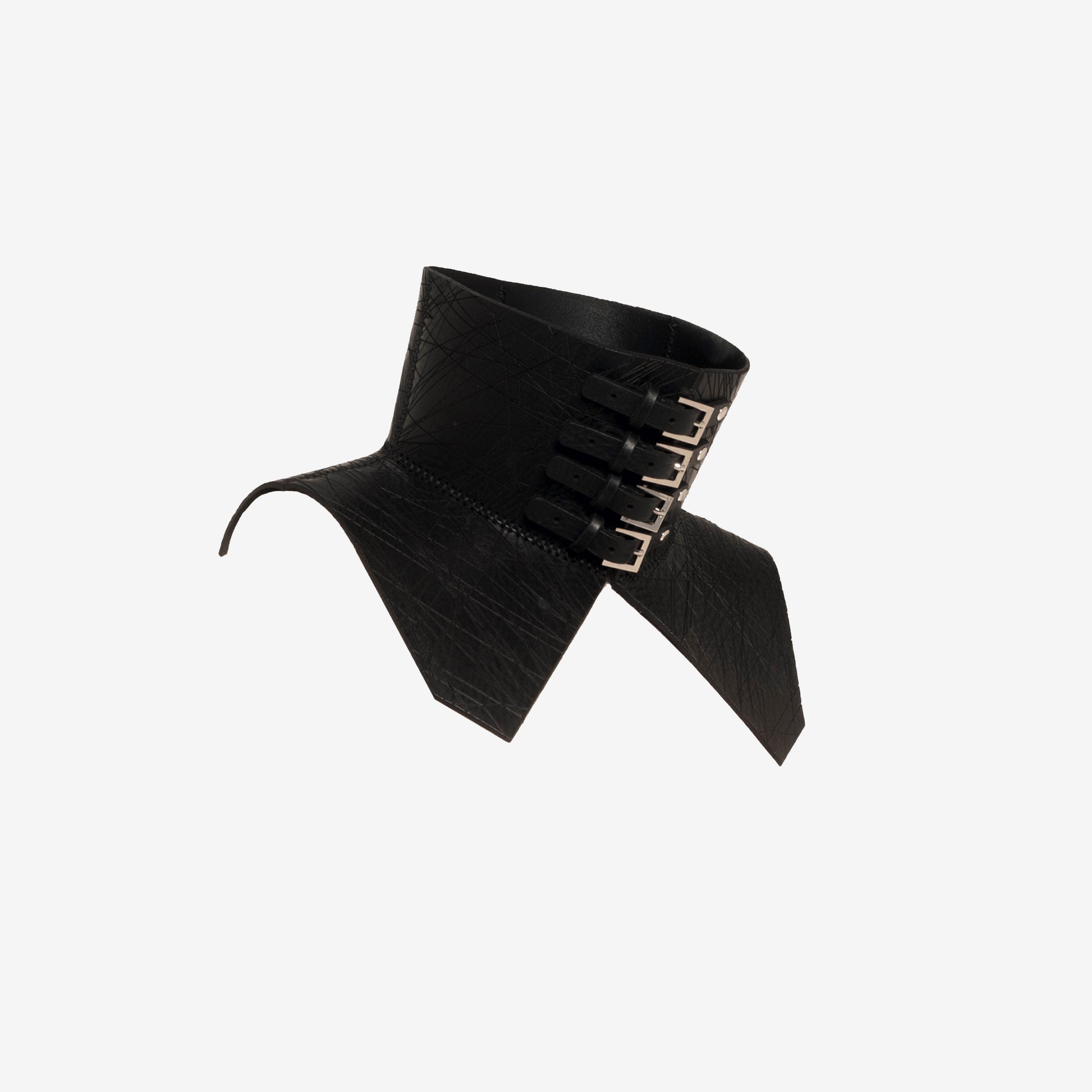 Laser cut and engraved asymmetrical lines leather neckpiece, detailed with saddle stitching. Finished with four buckle closures.
