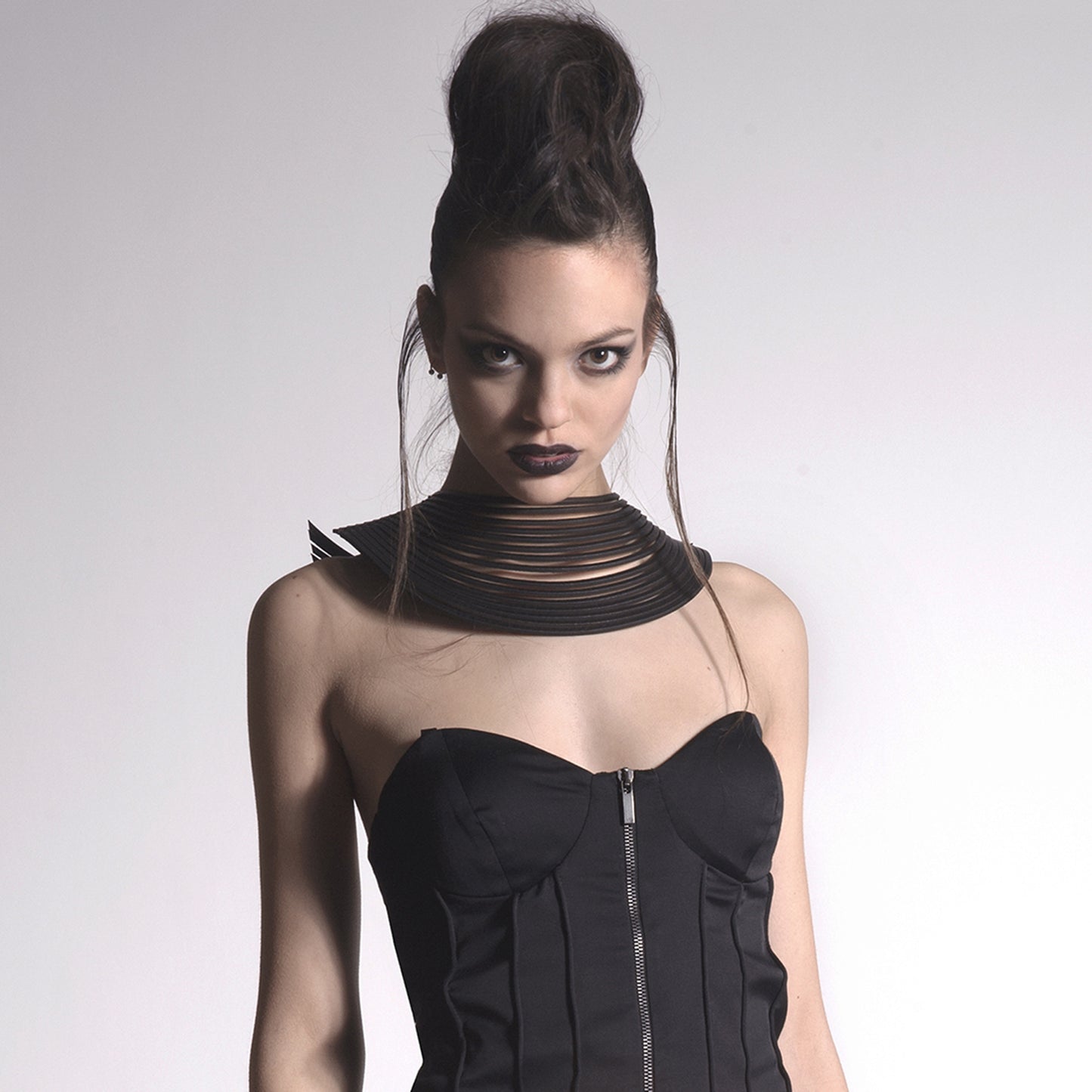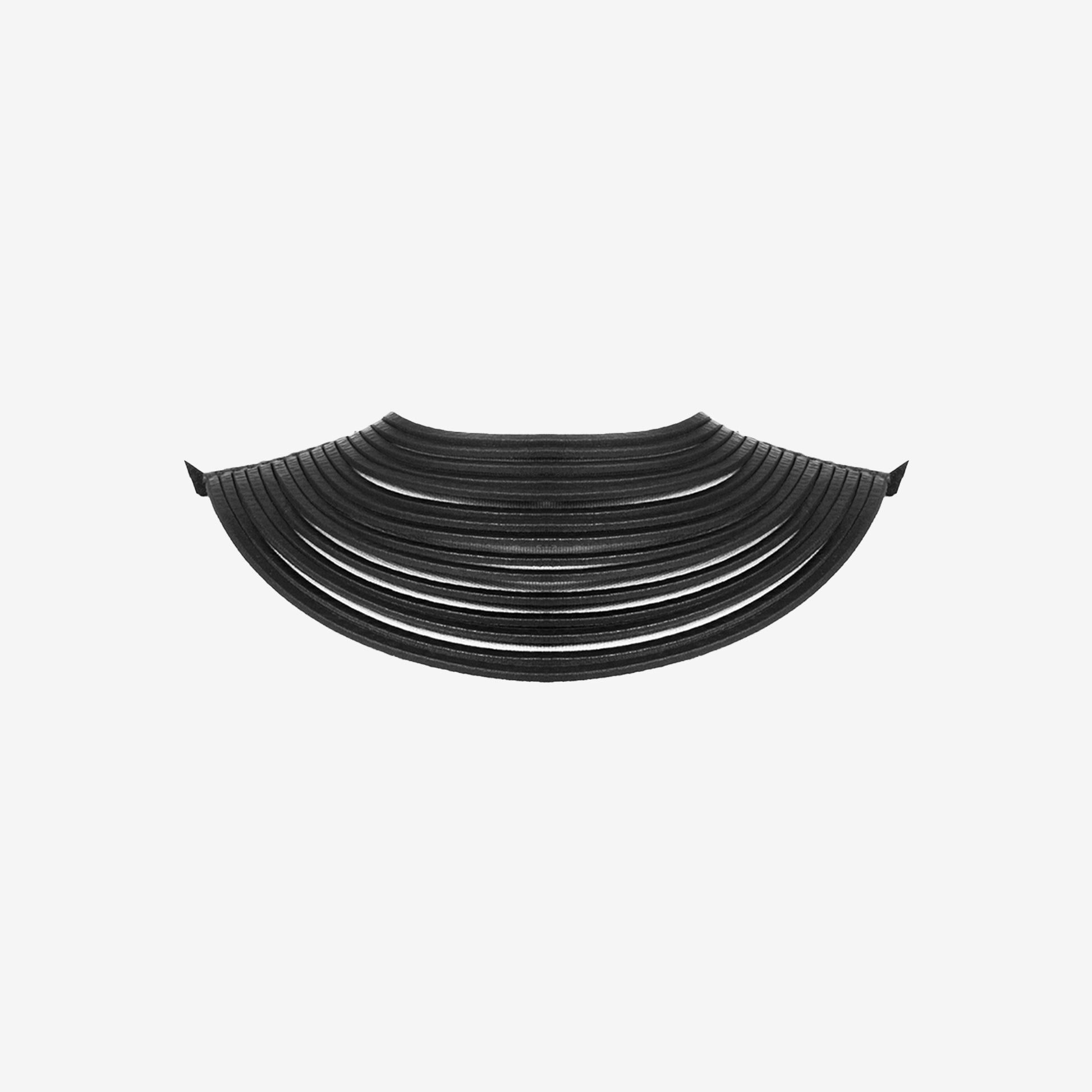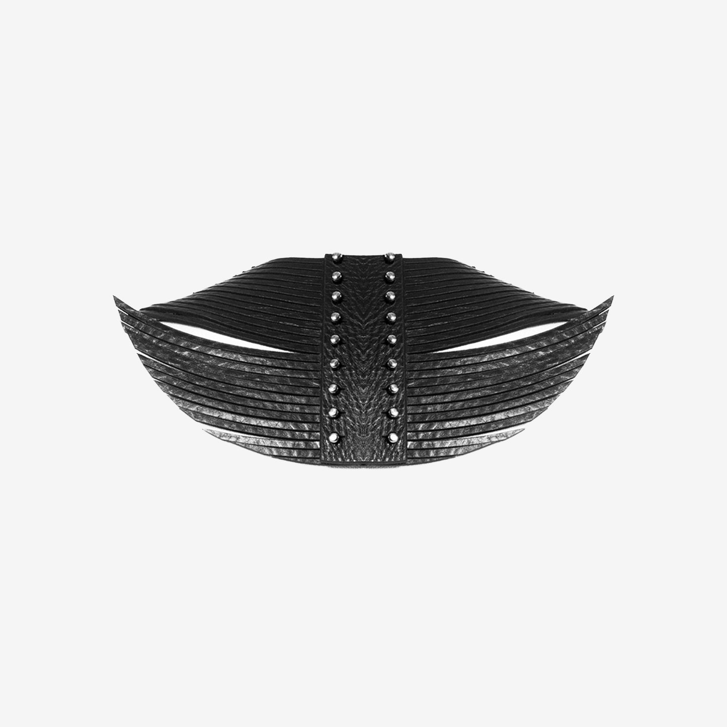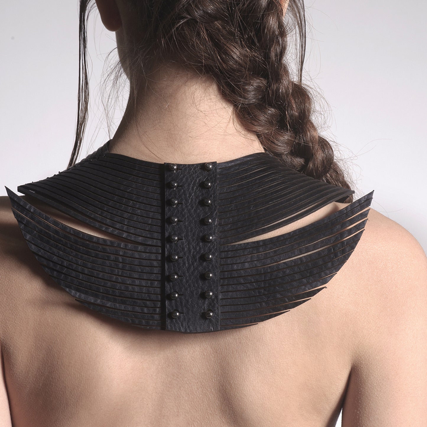 Laser cut leather neckpiece, detailed with saddle stitching. Finished with a push stud fastening.